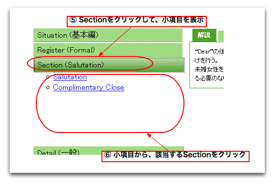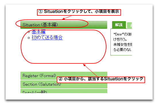 まず、『Situation』をクリックして小項目を列挙させてください。このページを開いたばかりのときはすでに開いています。列挙した項目の中から、該当するシチュエーション(基本編)をクリックしてください。 |