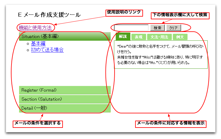 授業で配布しました資料(解説、例文、フレーズのリスト)を同一画面内で素早く検索しながら、英文Eメールを作成できるようにするためのツールです。 授業で学んだことを反復練習することによって、定着できるようにすることが目的です。