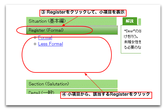次に、『Situation』と同様に『Register』をクリックして、『Register』欄の小項目を列挙させます。列挙した項目の中から、該当するレジスタ(Formal)をクリックしてください。 |