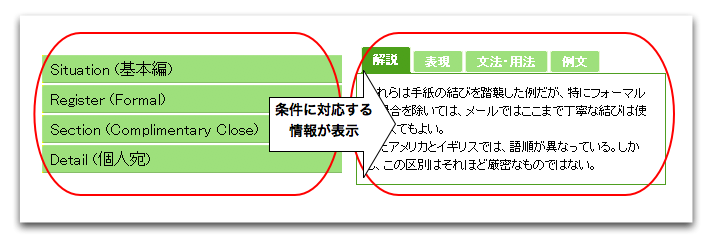 すると、選択してきた各項目に該当する内容が、画面右に表示されます。タブ(「解説」、「表現」、「文法・用法」、「例文」)をクリックして必要な情報を表示させてください。