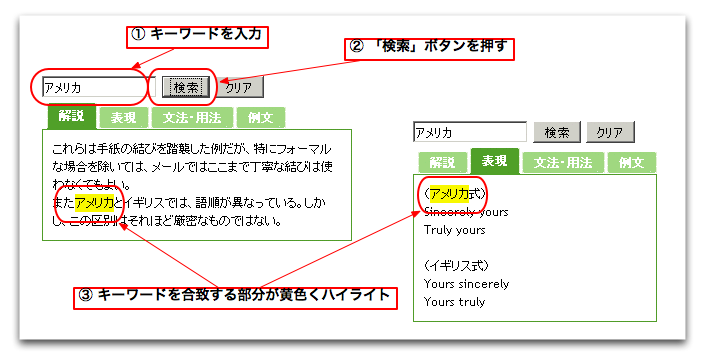 このツールには、簡易な検索機能があります。テキストボックスにキーワードを入力して「検索」キーを押せば、そのキーワードが黄色にハイライト表示されます。このハイライトの部分で該当する場所をさがす手助けにしてください。「クリア」キーを押せば、入力したキーワードが消去されてハイライトも消えます。