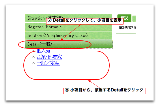 最後に、『Detail』をクリックして、『Detail』欄の項目を列挙させます。列挙した小項目の中から、該当する詳細をクリック(個人宛)してください。 |