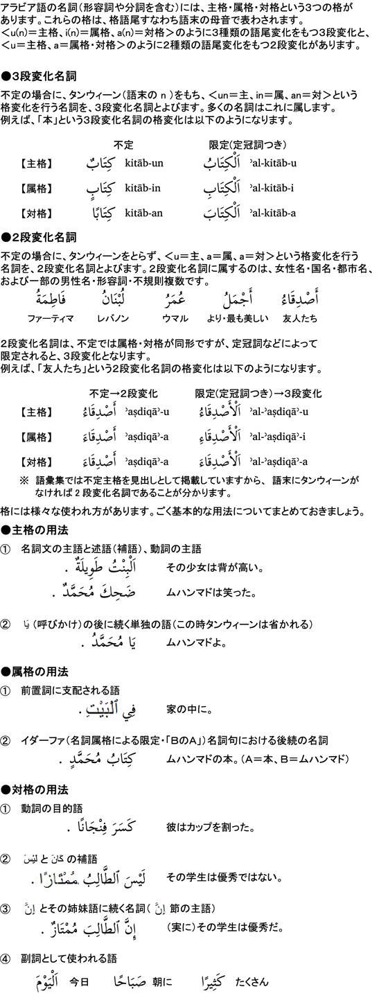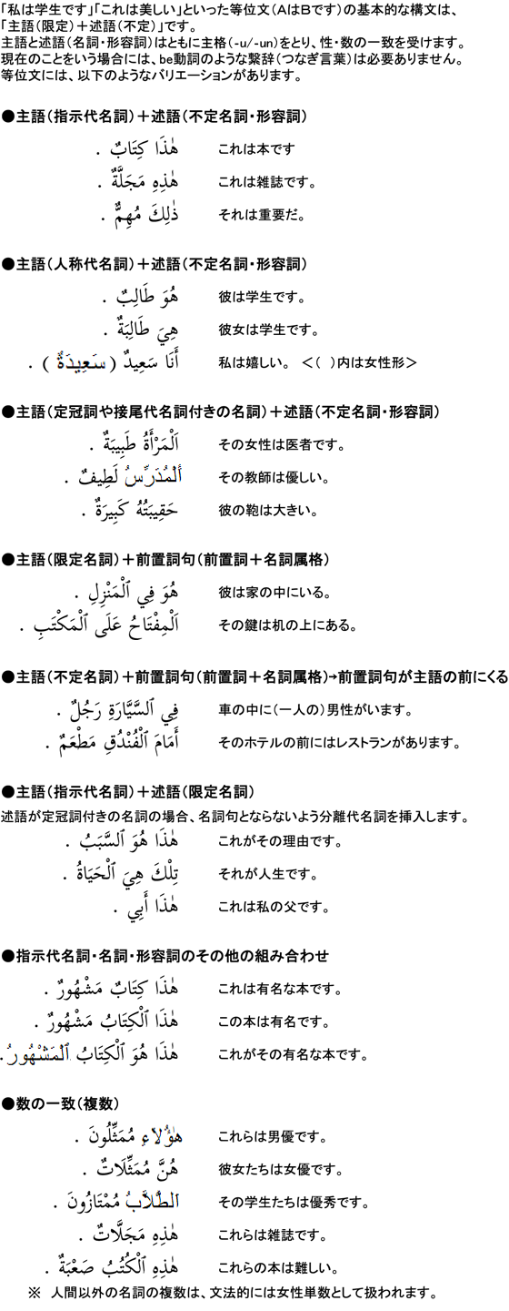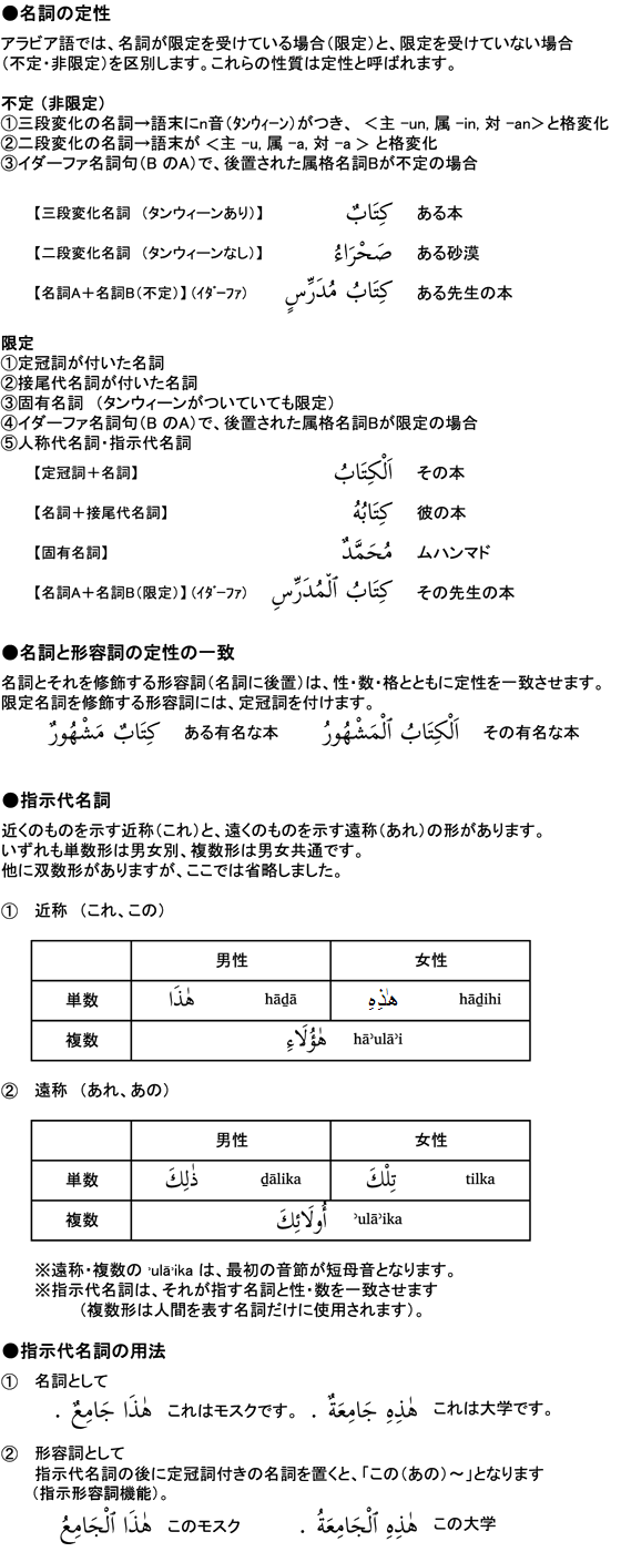 ここでは、1.名詞の格、2.名詞の定性・指示代名詞、3.等位文(AはBです)の3項目について解説しています。この課で、名詞に関する基本的な文法事項(性・数・格・定性)が出そろいます。色々なパターンの等位文が使えるよう、名詞の基本をしっかり理解しておきましょう。